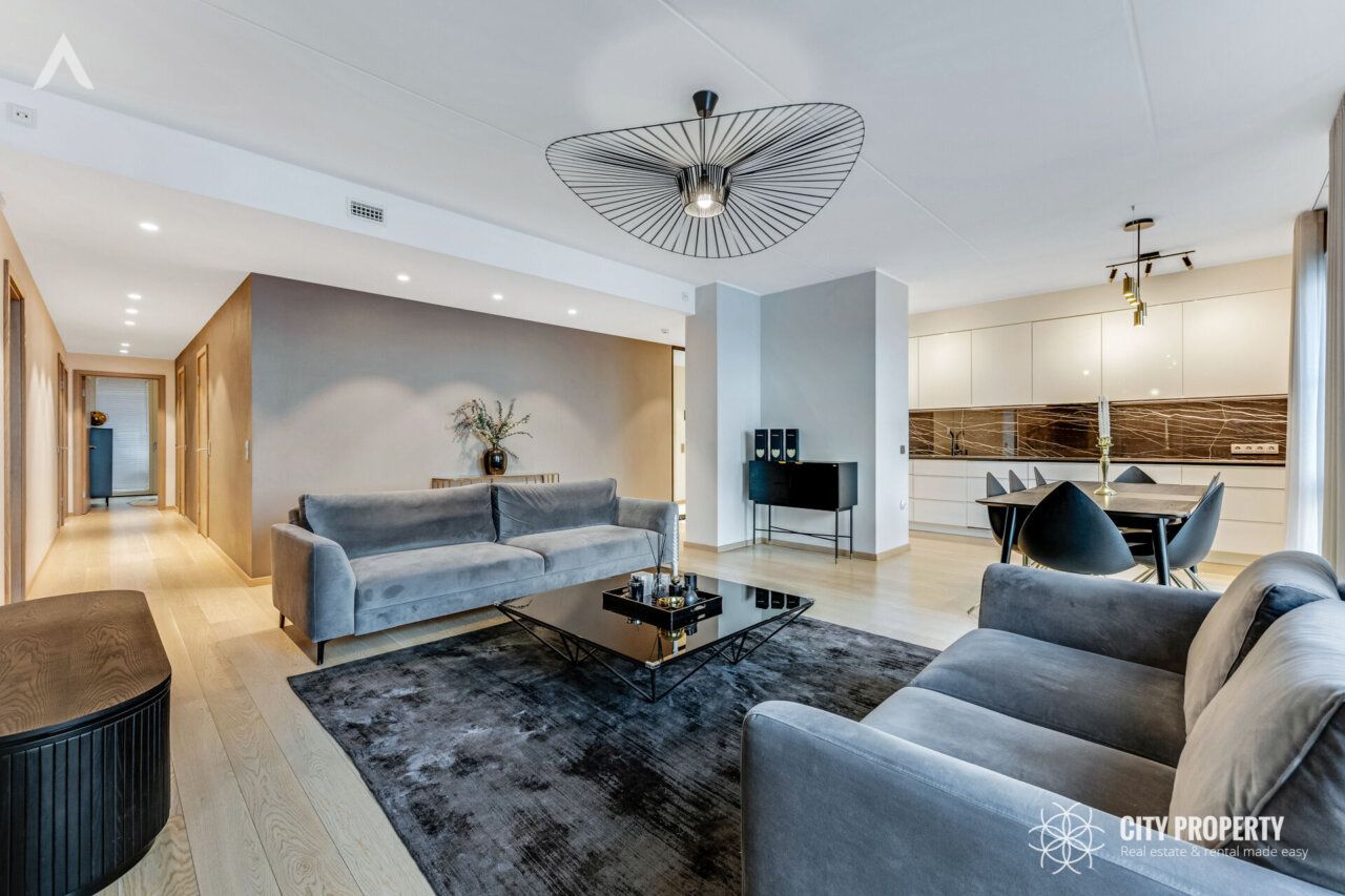 Korteri sisekujundus on harmooniline ja stiilne, kus domineerivad naturaalsed toonid, luues ajatu ja luksusliku atmosfääri. Sisustuselemendid on spetsiaalselt valitud, et täiendada korteri ruume.